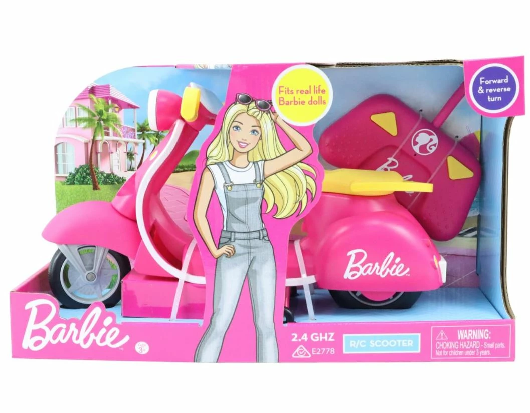Now Barbie can travel in style with the Barbie RC Scooter that fits any Barbie Doll! This radio control vehicle travels forward & reverse turn with front and lights. Over 30cm long, with alloy looking wheels and finished in the iconic pink styling, this is the ultimate Dream ride Barbie has been waiting for!