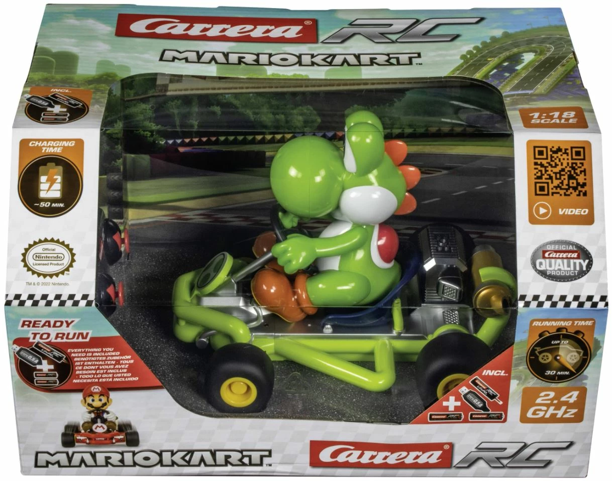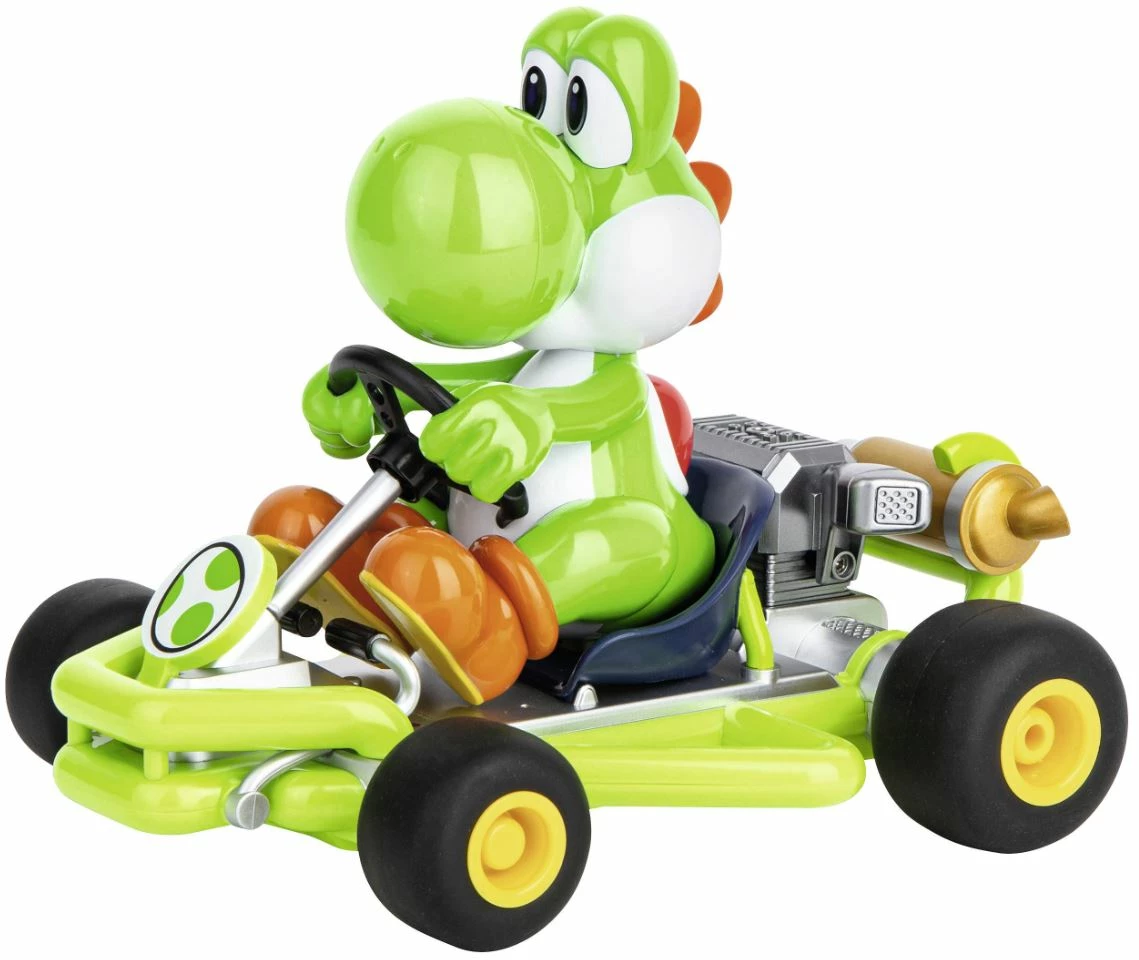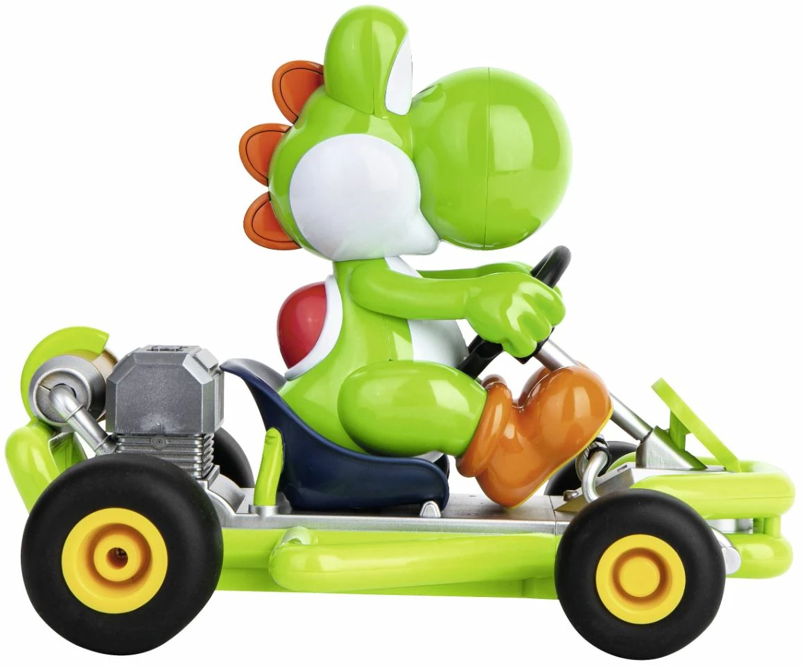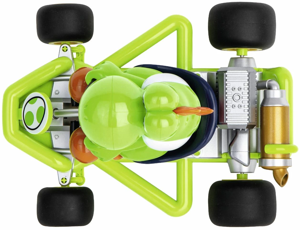 Yoshi is ready to race in his sleek looking Pipe Kart, NEW from Carrera. The 1:18 scale radio control car features pneumatic tires, full function steering, and can accelerate up to 9 km/h – 5.6 mph on various courses across multiple terrains.