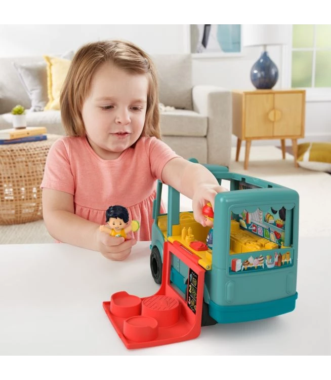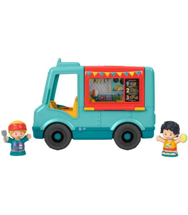 As kids press the button or the drivers seat of this musical toy, theyll hear songs, sounds and phrases to enhance the play. The pretend taco truck has a play kitchen, a fold-out dining area, and comes with two Little People® figures to act out all sort of fun stories!
