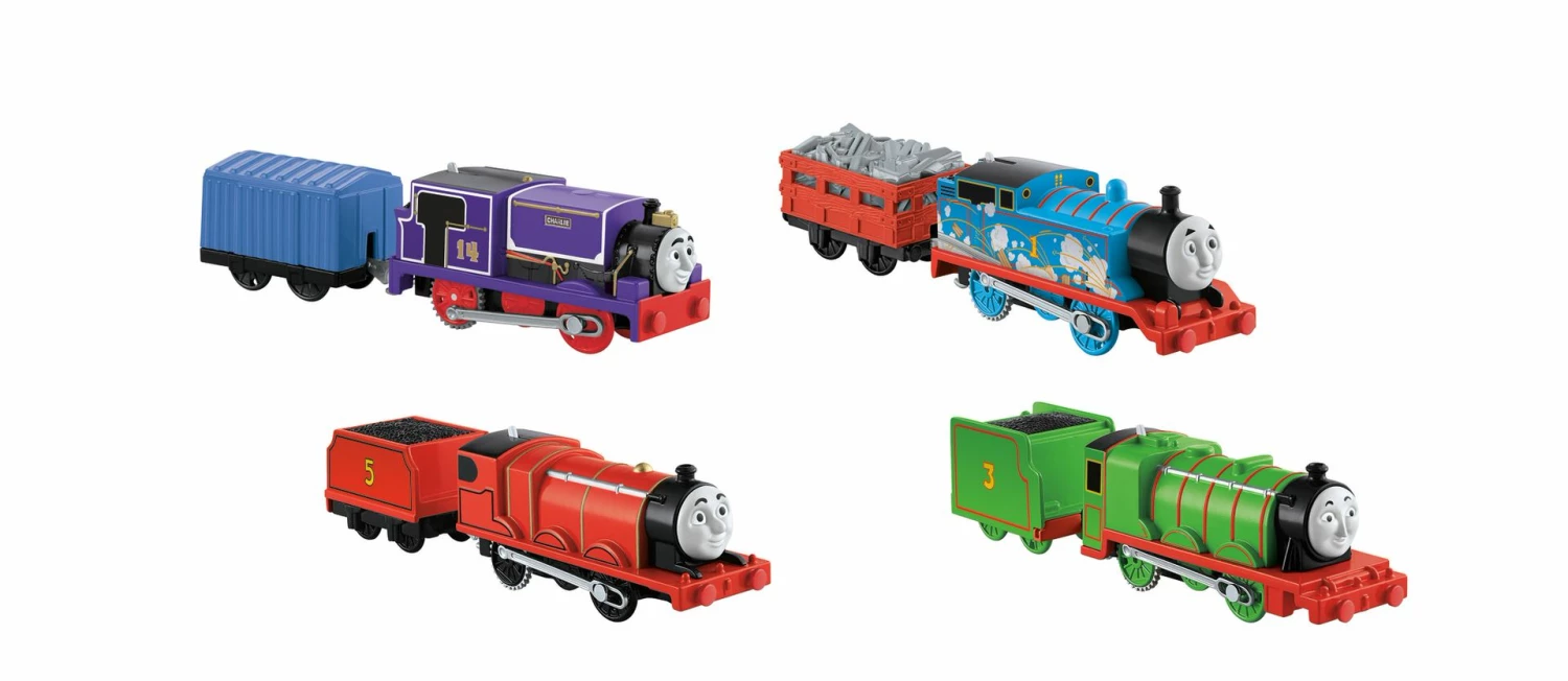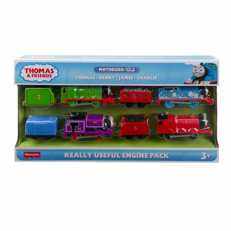 TrackMaster motorized toy trains from Fisher-Price take Thomas & Friends to greater speeds, taller heights, and bigger adventures! Create your own railway full of Really Useful Engines, and experience the Island of Sodor like never before. This 4-pack includes Thomas with an exclusive steam and spark design, James, Henry, and Charlie. Full steam ahead for exciting, motorized action! Features: 4-pack of TrackMaster battery-operated motorized toy trains Flip their switches to see them race along Includes Thomas, James, Henry, and Charlie Thomas features an exclusive steam & spark design Motorized train play is compatible with TrackMaster track and train sets (sold separately) Collect all your favorite Thomas & Friends characters to expand your motorized railway (sold separately)
