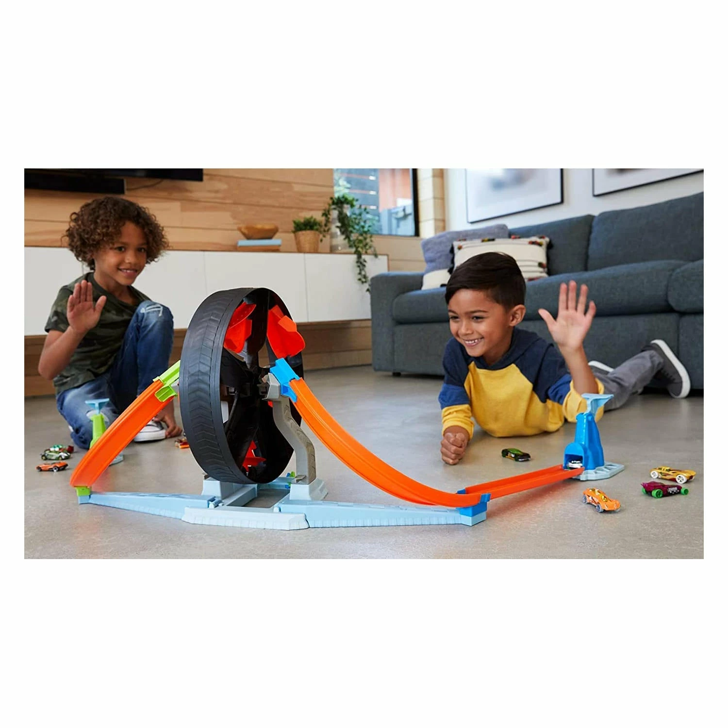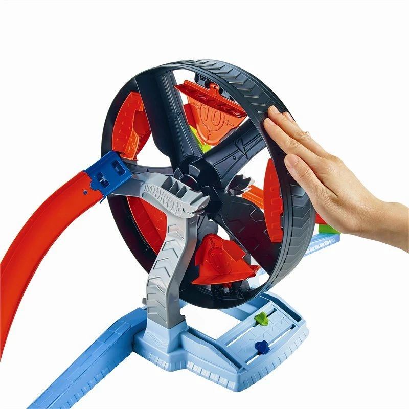 This exciting Hot Wheels play set includes everything kids need to test their high-performance driving skills. With the spinning wheel, two launchers and two cars included, kids can challenge themselves and each other to launch their cars down the track, through the spinning wheel and hit the scoring flaps on the wheel for points! Highest score total wins the day, but the challenge itself is where the fun is. Helps develop kids’ motor skills, timing and competitive drive! Features: Play set provides hours of fun and tons of imagination with launchers, cars, track and Spinwheel included along with easy set up instructions. Launcher develops motor skills while the effort to pass through the spinning wheel introduces the concepts of speed, distance and timing. Playing solo on the play set can encourage patience and attention to timing, while playing head-on-head develops competitive spirit. Launching thru’ the Spinwheel and scoring points provides a focused activity and objective that takes car play to a higher level of fun and discovery. A great gift for 5 year olds and up with high flying action and scoring.