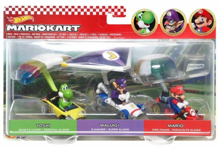 Kids can choose their favorite Mario Kart characters and speed off for racing and stunting madness with a Hot Wheels® 1:64 scale die-cast vehicle with a glider attachment just like in the video games!