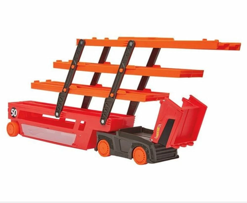Fire up storytelling and take the Mega Hauler on the road for awesome adventures. Six expandable levels can carry up to fifty 1:64th scale vehicles!