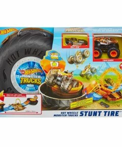 The Hot Wheels Monster Trucks Stunt Tire folds up with a handle for portability and opens to reveal an over-the-top stunt arena for crashing, smashing and storing. The assembled set is 35+ inches long with awesome features.