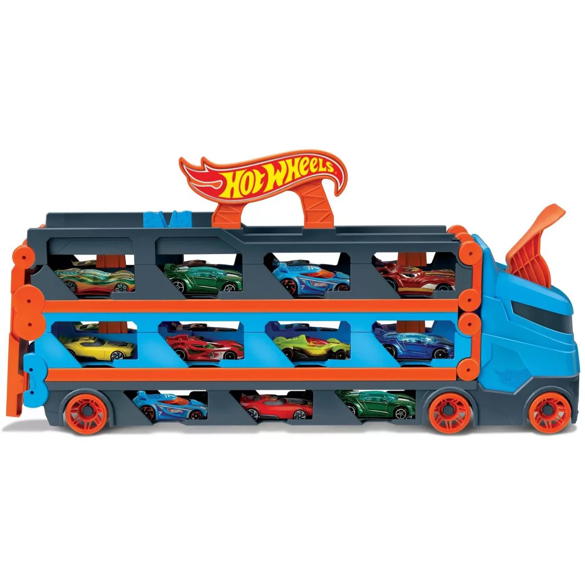 The Hot Wheels® transporter vehicle comes with 3 Hot Wheels® cars and space to haul more than 20 (additional cars sold separately).