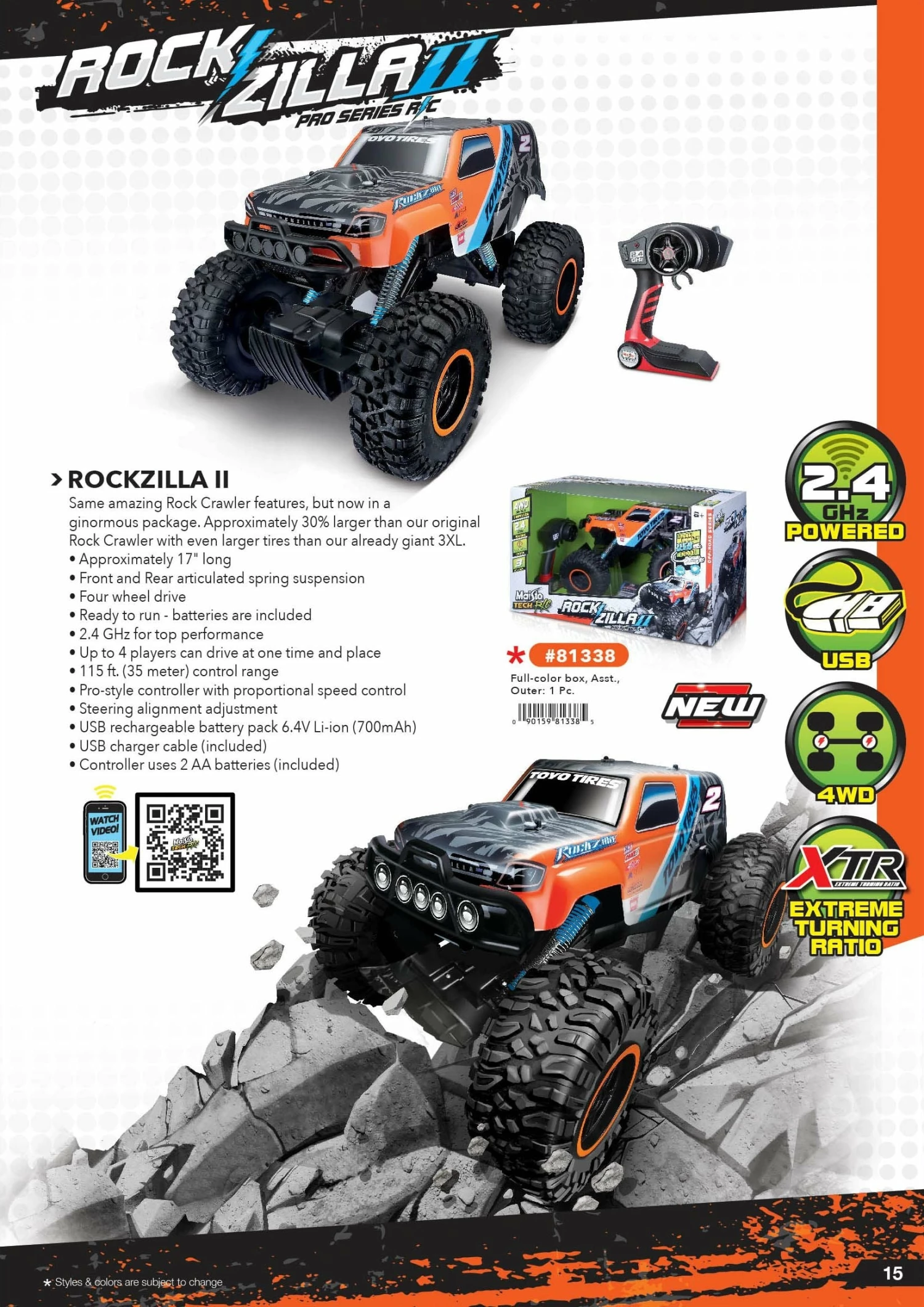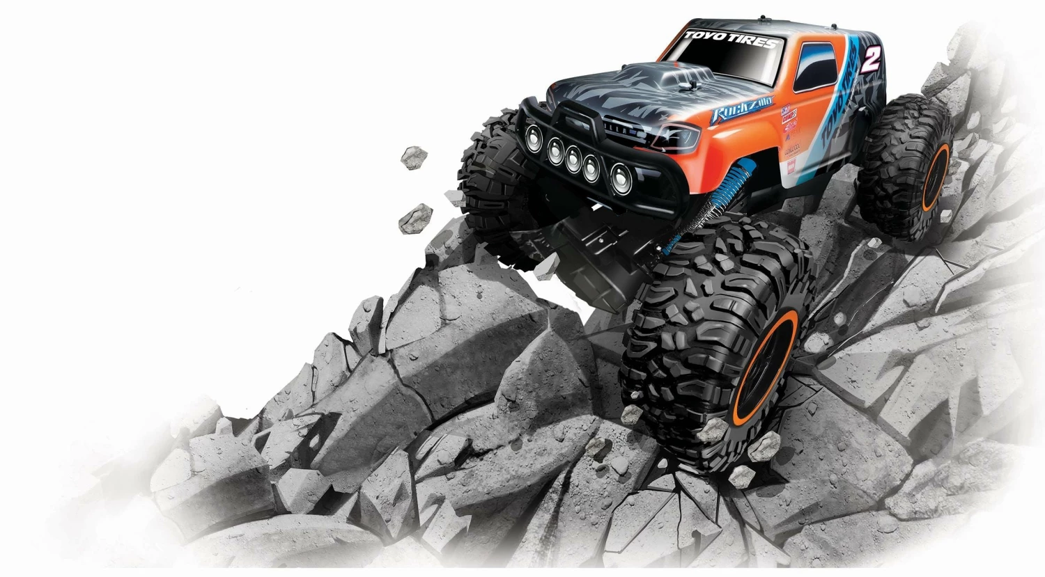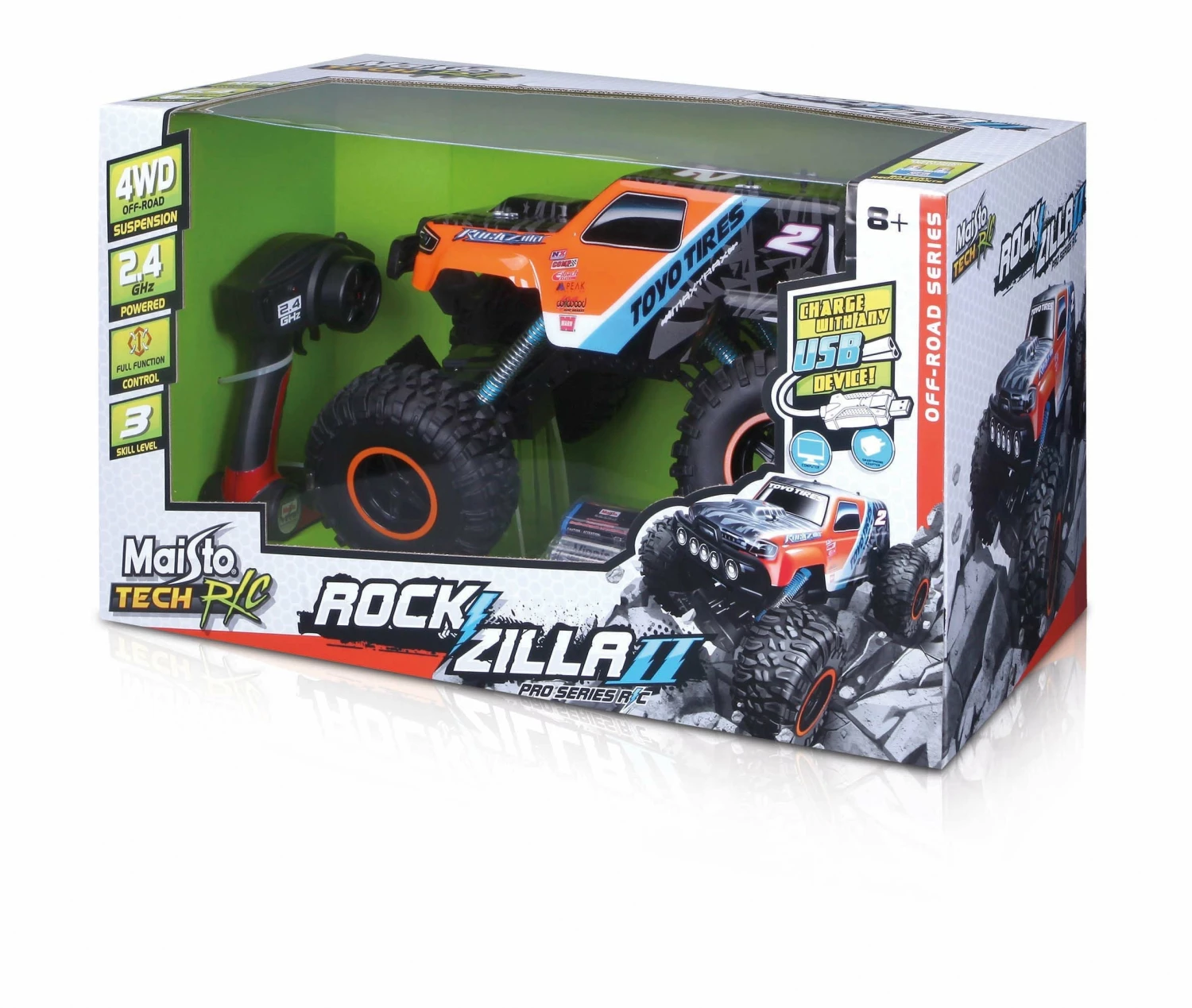 The new “Rockzilla 2” from Maisto Tech R / C is bigger than the original Rock Crawler, has even bigger tires than the gigantic 3XL and has great features. It has front and rear suspension, Pro Style remote control, all-wheel drive, a 2.4 GHz frequency and a rechargeable USB battery. With its speed of approx. 6.1 km / h and a range of approx. 35 meters, the Rockzilla 2 is suitable for children from 8 years of age.