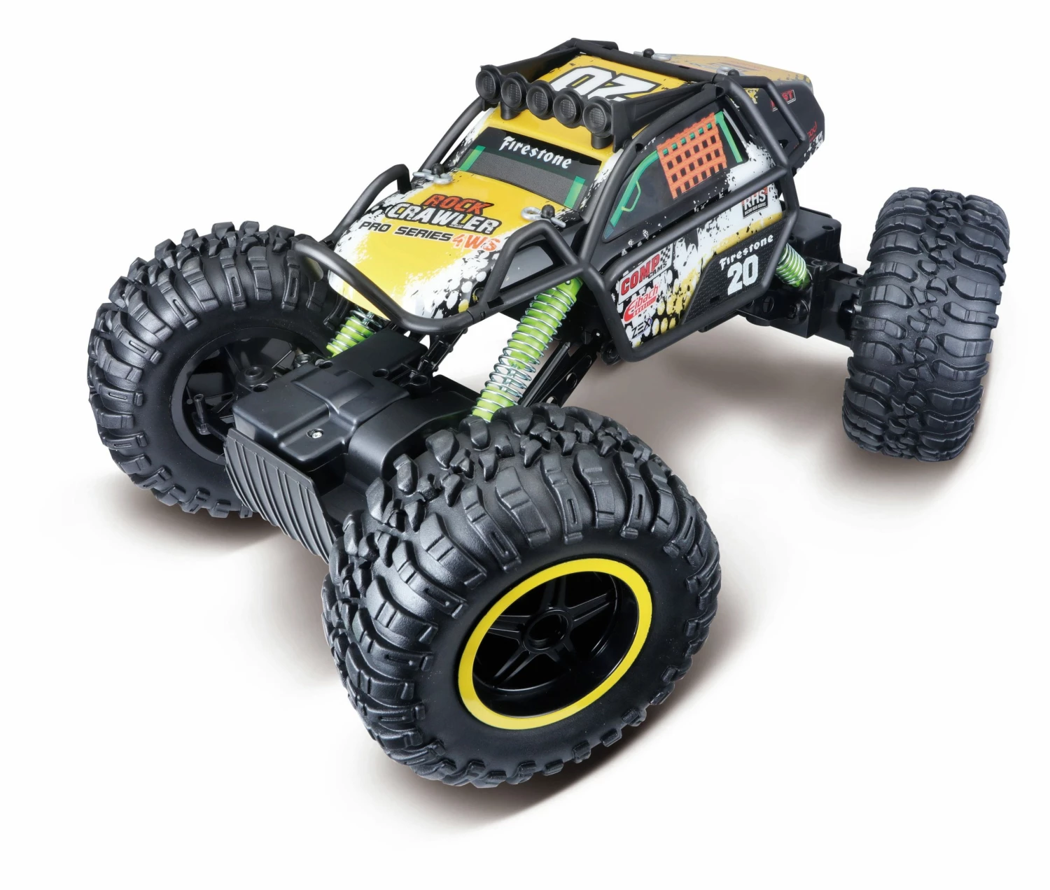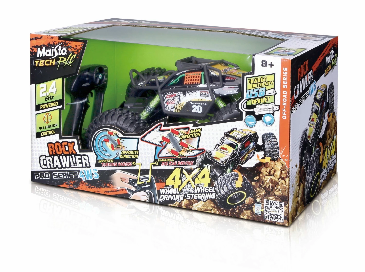 The R/C Rock Crawler Pro Series 4WS from Maisto Tech is an advanced off-road RC car with true 4-wheel steering modes. Approx 38cm Long. Front & Rear Articulated Suspension 4 Wheel Drive 3 Mode 4 Wheel Steering Ready to Run – Batteries Included 2.4GHz Radio System – up to 4 cars in play at the same time 35m range Hobby style controller with proportional speed control.