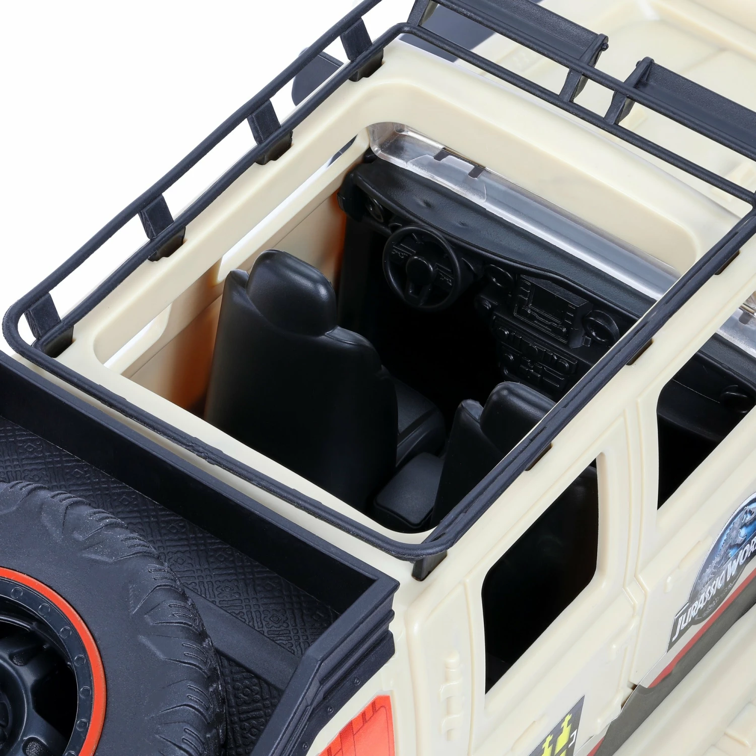 The 1:18 scale R/C vehicle has full functionality — kids can use the remote control to move backward, forward, left and right as they play out dino chases and captures!