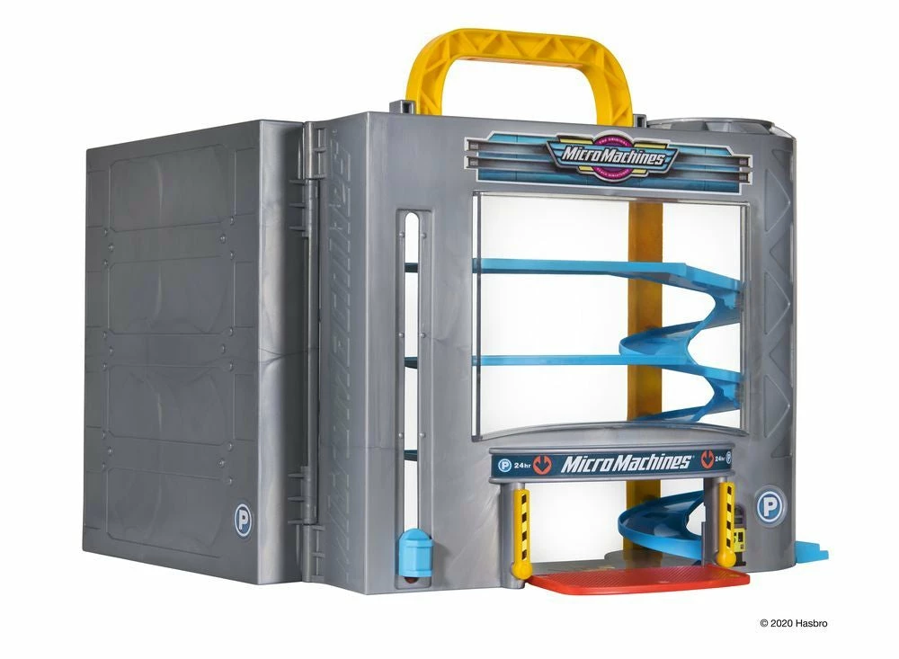 Open the garage to reveal 5 levels of parking. Take the moving elevator to the top floor and race down the spiral ramp to exit the multi-level garage in a hurry. Close up the garage and carry over 45 of your favourite Micro Machines on the go.