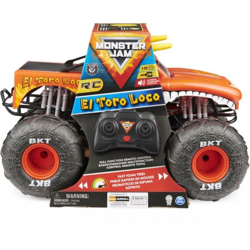 Take control of the official Monster Jam raging bull with the all-new, official El Toro Loco RC in 1:10 scale! The all-new El Toro Loco RC features fast foam tires for speed and performance. With a detailed body, official BKT Tires and authentically styled chassis,¬¬ this replica El Toro Loco can handle anything! Perform epic stunts with this remote control monster truck! El Toro Loco RC is ready to roll right out of the box – 2 AAA Duracell batteries included!