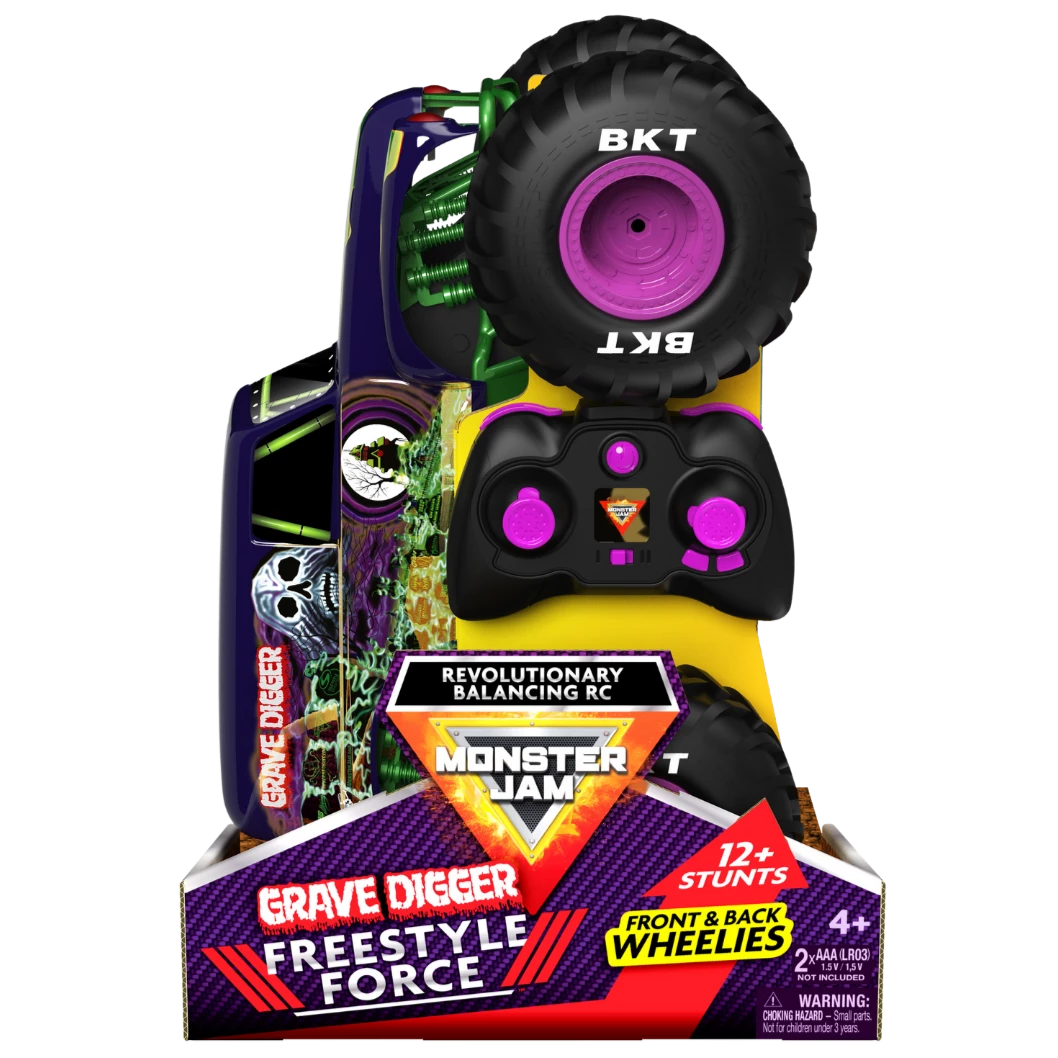 FULL-FUNCTION REMOTE CONTROL TRUCK: Grave Digger Freestyle Force RC Truck Controller requires 2 AAA batteries (not included).OFFICIAL MONSTER JAM RC: The ultimate Grave Digger Freestyle Force RC in 1:15 scale features premium metallic deco, special edition styling, vivid color design, official BKT tires, and look-alike chassis!