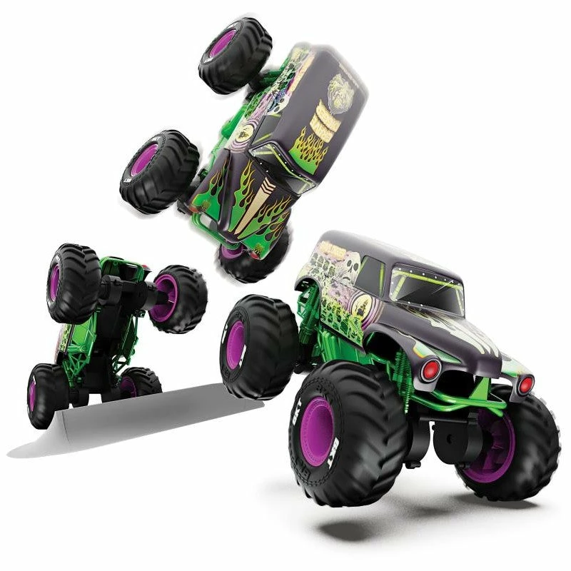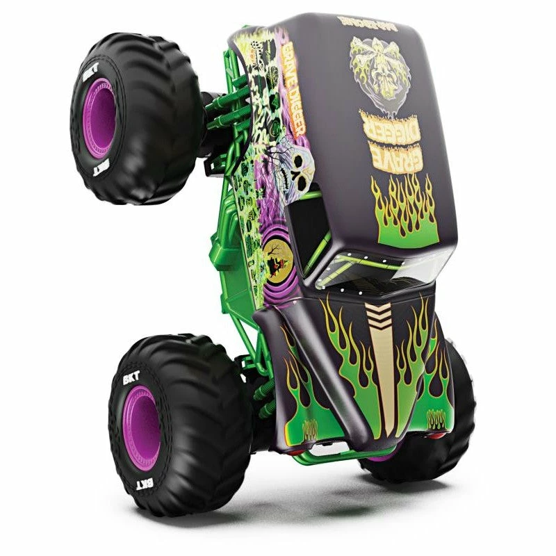 Controlling this Monster Jam RC is just like driving the real truck and a must-have for any Monster Jam Grave Digger boy toys fan! This exclusive Grave Digger has premium metallic chrome deco, official BKT tires, and look-alike chassis. The Freestyle Force RC is USB rechargeable, so you can easily power up and continue the Monster Jam action. Master incredible stunts and tricks with the official 1:15 scale Monster Jam Grave Digger Freestyle Force RC!