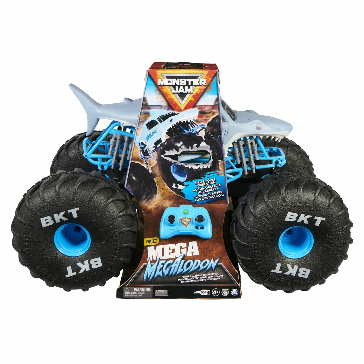 Overcome any obstacle with the biggest Megalodon RC vehicle, the MEGA Megalodon! This powerful all-terrain remote control vehicle measures over two feet long and puts you in control of epic Monster Jam action!