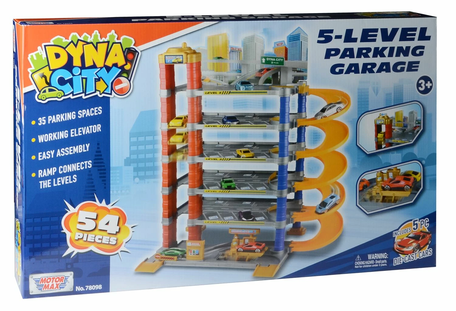 This easy to assemble set includes 35 parking spaces, 5 die-cast cars, a working elevator and ramps that connect each level!
