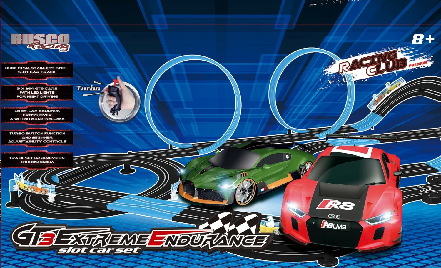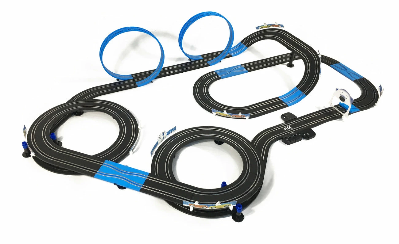 1:64 Slot car set with 2 cars and over 13.5M of track. LED lights for night driving and double loops, Bank curves and Bridge systems.