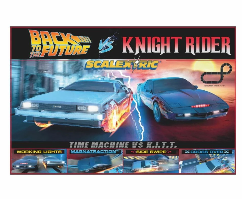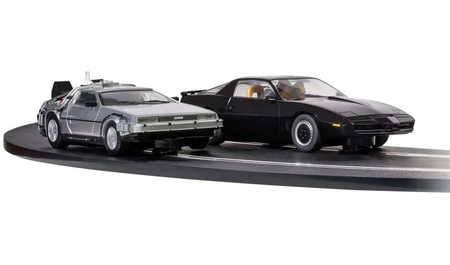Two of the most iconic film cars ever go head-to-head in this brand-new set from Scalextric! Will you be Michael Knight in K.T.T.? Or Doc or Marty McFly in the Back to the Future Time Machine? Whether you are doing 88MPH or chasing down bad guys, red LED lights flashing on either car is a guaranteed winner on the big screen, small screen or Scalextric track!