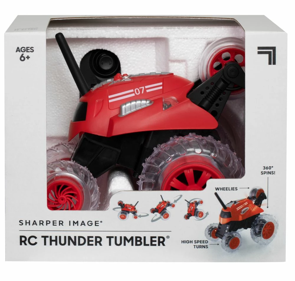 The Thunder Tumbler features a race car/mini monster truck hybrid design that’s perfect for both racing and doing stunts! It’s compact enough to be kid-friendly, too.