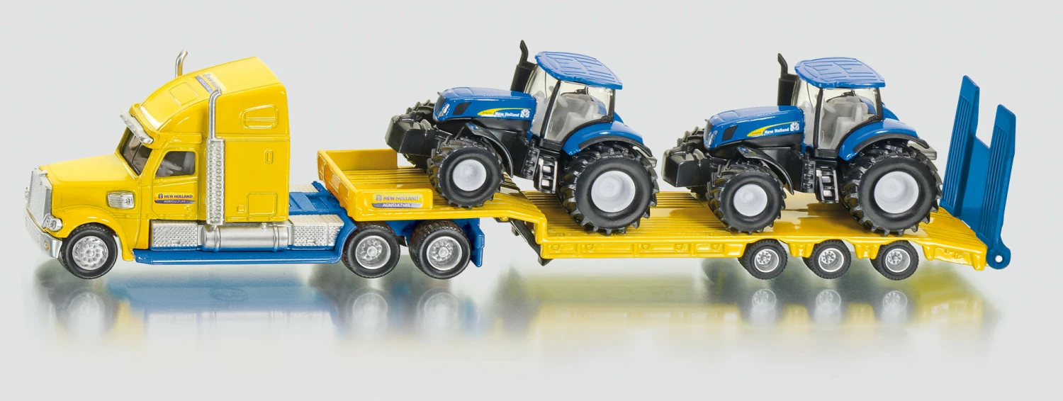 The chunky US truck featuring the world-famous New Holland tractor brand design has no problems towing two large tractors from the T8 series. Mainly produced in die-cast metal, the models are kept in typical New Holland blue and yellow colours. Tractors’ cabins are removable. All vehicles with rubber track and original detail wheel rims.