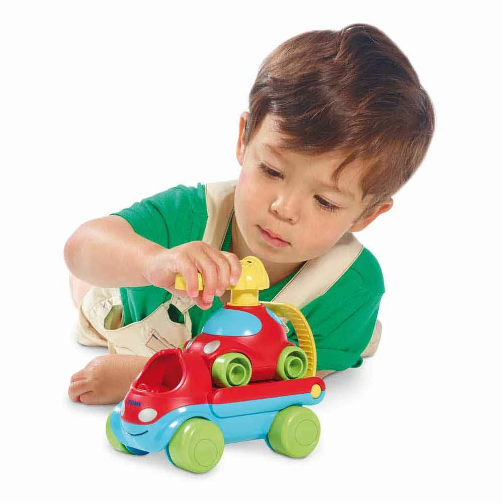 Place the car on the truck, wind up and see the pair magically move as one.