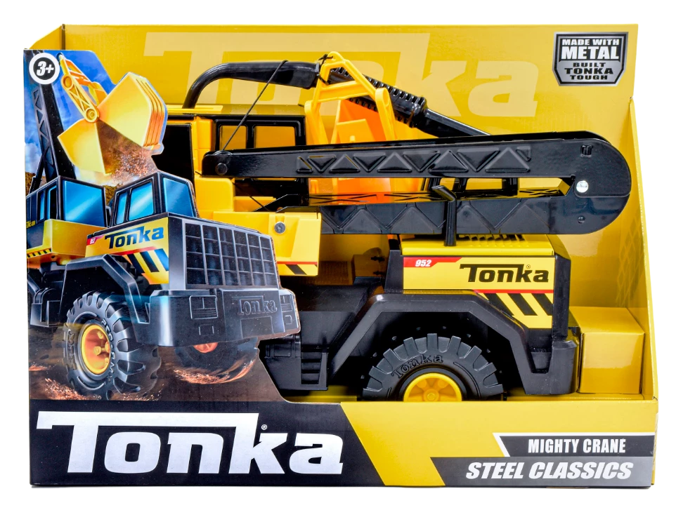 The Tonka Steel Classic Mighty Crane! Built Tonka Tough – Made with real STEEL, this sturdy Tonka vehicle rotates 360 degrees, lifts and carries – just like a real crane.