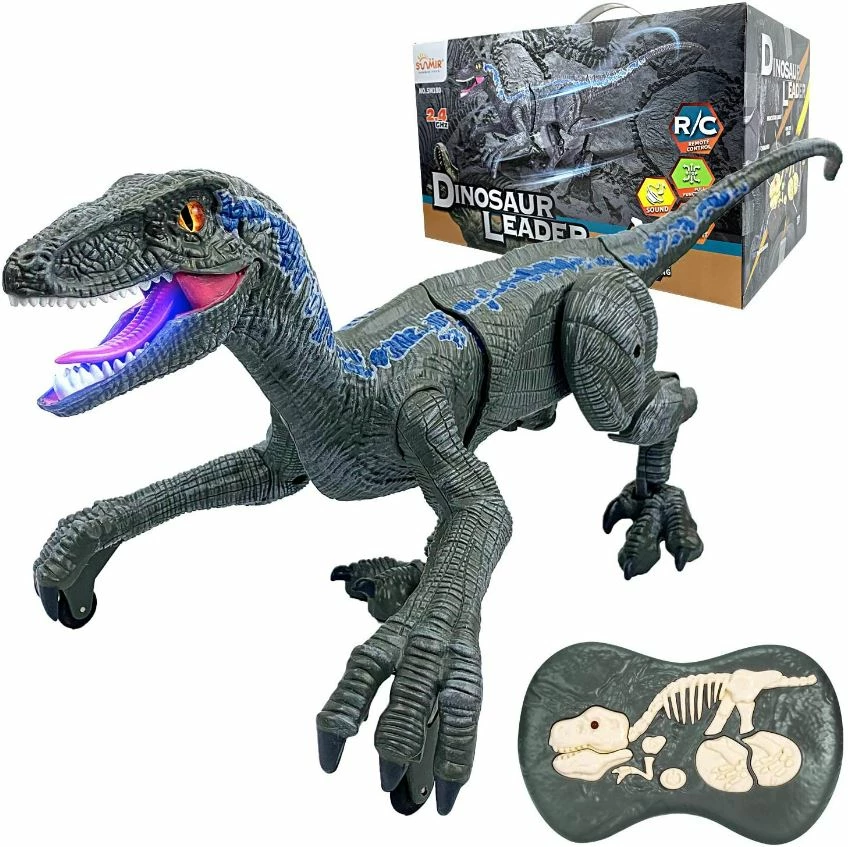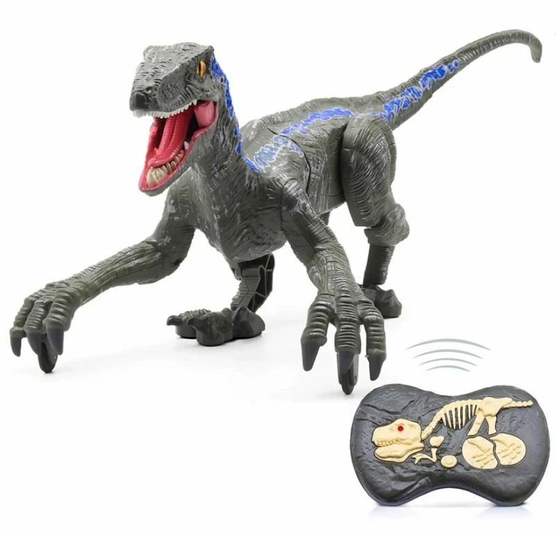 This remote-controlled dinosaur brings the real Jurassic dinosaur Velociraptor to life with walking movements. This remote-controlled dinosaur has 3D eyes that mimic the real eyes of a dinosaur, as well as walking, growling, swinging its body and tail from side to side, and imitating a real dinosaur.