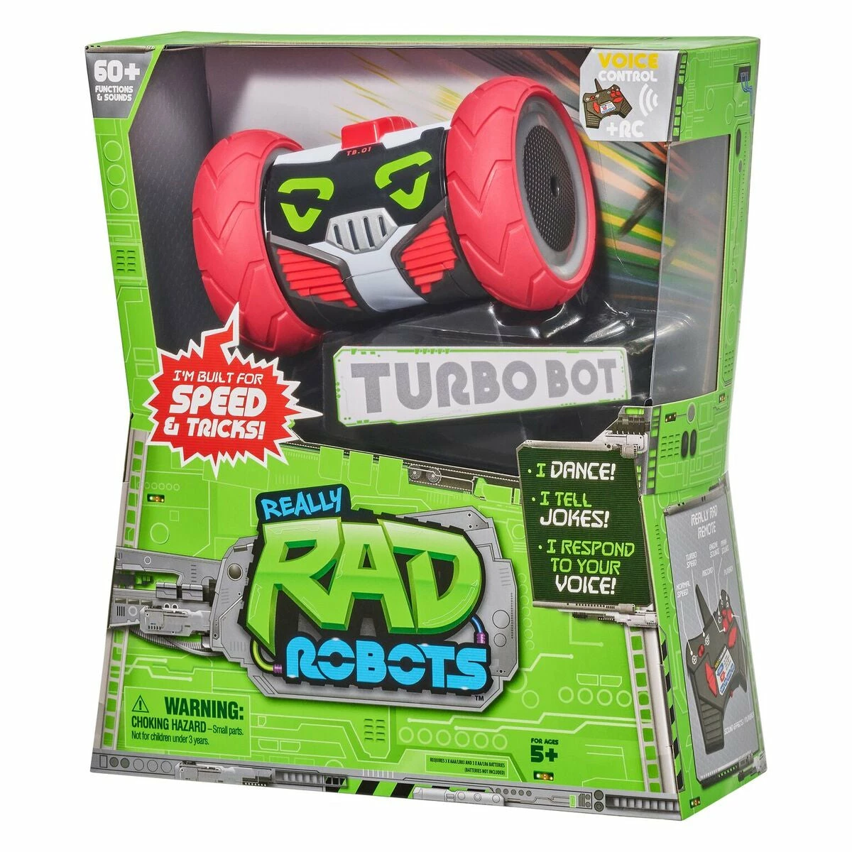 Meet Turbo Bot – Really RAD Robot’s Speed Machine! A fast moving robot with a fast talking mouth, this guy is full of personality and tricks, and comes with over 60 functions and sounds! Take hold of the multi function RAD Remote and take Turbo for a spin. Turbo’s remote is full of features including a “Turbo” Boost” button! Switch to “Turbo Mode” and check out why this Robot matches it’s name! Turbo even has Crash recognition! Turbo knows when it has hit something and can change direction! With voice command you can tell Turbo what to do or just chat with him! Tell him to “Spin”, “Dance”, “Explore” or even get him to tell you a joke! Turbo is full of personality! With a databank of cool sound effects and expressive light up eyes, Turbo loves to make you laugh! With record and playback feature Turbo can record a message and playback to trick, prank and surprise your friends. Take control! It’s time to roll with Turbo! 5+
