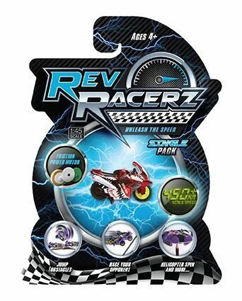 Unleash the speed with Rev Racerz! Choose your design, rev it up, and release your bike! Watch the bikes reach scale speeds of up to 450km with the push power motor! Race, jump, spin and perform awesome stunts. Age 4 +