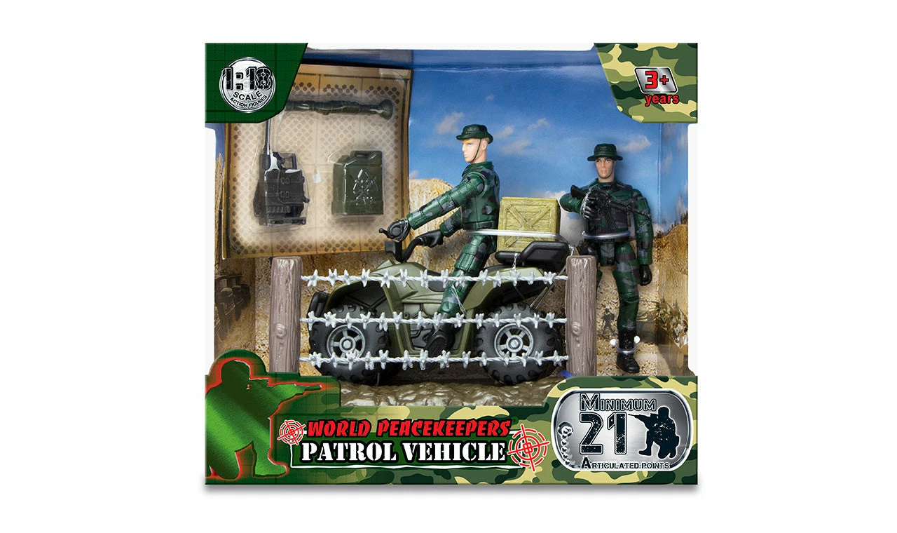 Children will enjoy hours of fun with the World Peacekeepers Quad bike with 2 figures and accessories. The Quad bike features rugged off-road tyres and real steering. Drive this around and you could help the World Peacekeepers deliver essential supplies to the frontline. Includes: Quad Bike 2 (1:18 scale) fully poseable action figures Accessories Note Size of Quad bike(Approx) Height 5 cm x Width 10cm Size of figures(Approx) Height 9.5cm Suitable for children aged 3+ Years NOT suitable for children under 3 Years — small parts — Choking Hazard